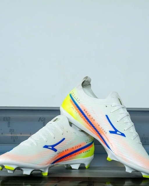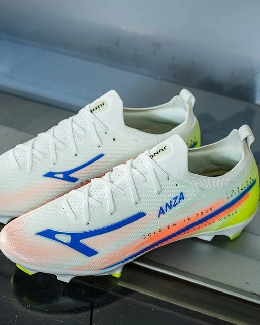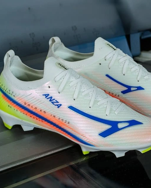 High-performance ANZA June 2025 football boots designed for speed and control. Lightweight, stylish, and built for firm ground play with a modern white, blue, and rainbow finish.