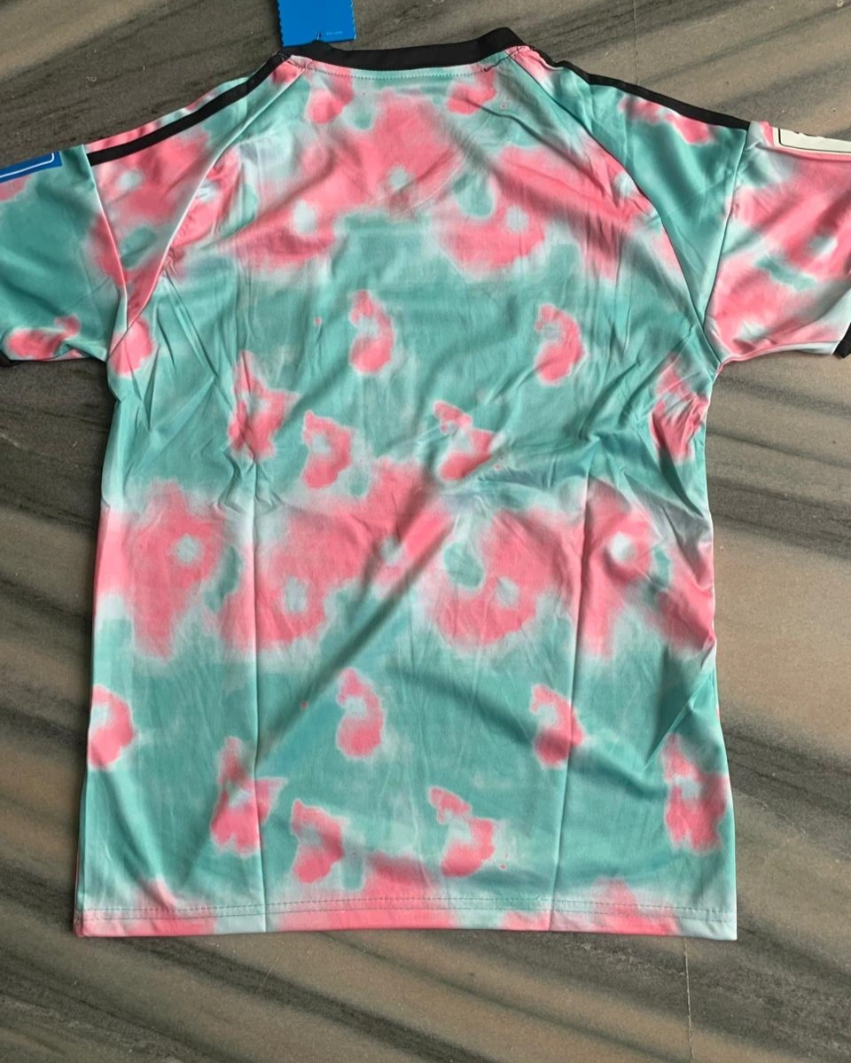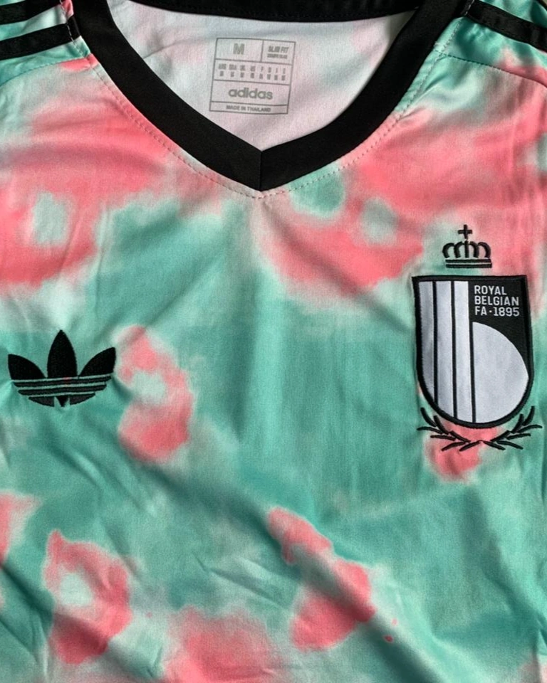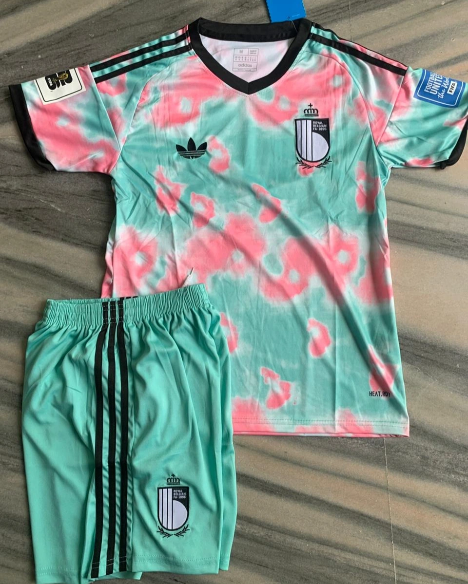 Stand out on and off the field with this Belgium 2026 away-inspired football kit. Designed with a bold mint green base and eye-catching pink tie-dye pattern, this set brings a fresh and modern twist to classic football style.
