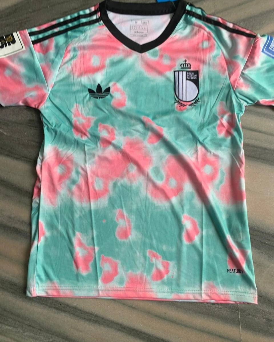 Stylish Belgium-inspired 2026 away football kit featuring a unique mint green and pink tie-dye design. Lightweight, breathable fabric with matching shorts—perfect for fans, training, or casual wear.