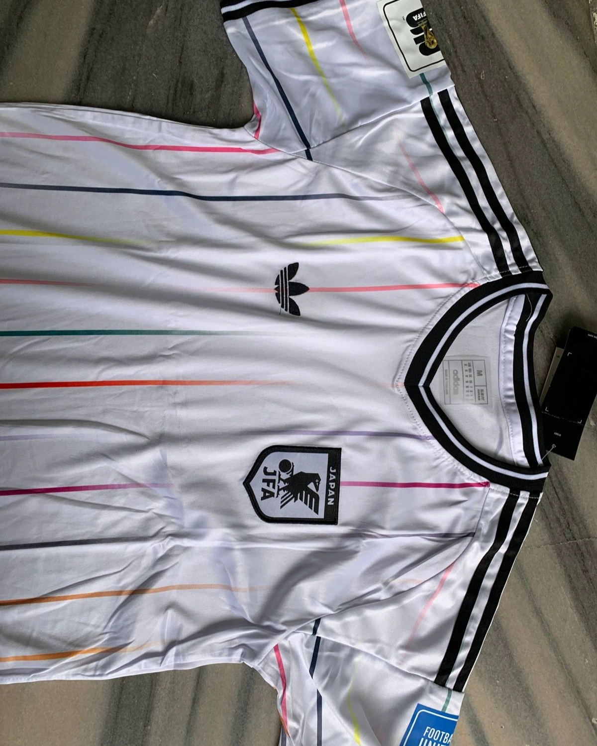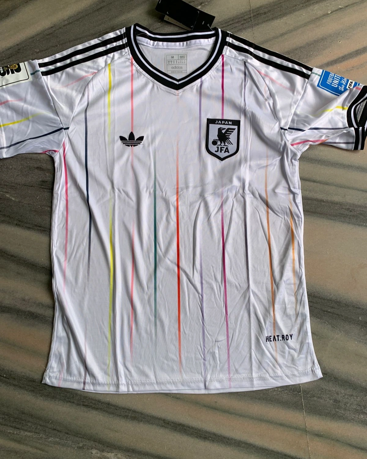 Show your support in style with the Japan 2026 World Cup Away Jersey, a modern and eye-catching kit inspired by innovation and tradition. This premium football set features a crisp white jersey enhanced with subtle yet vibrant vertical multicolor stripes, symbolizing energy, diversity, and forward movement.