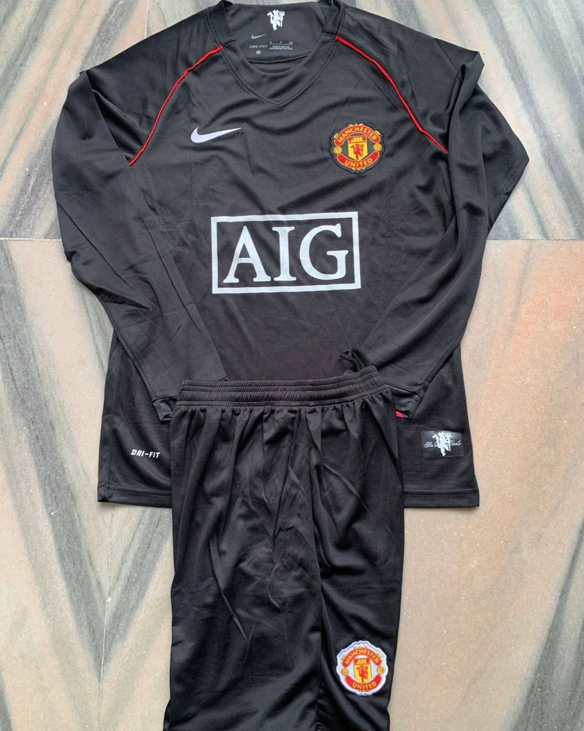 Classic black Manchester United-inspired long sleeve jersey with matching shorts, featuring iconic AIG sponsor design and breathable performance fabric—perfect for football and casual wear.
