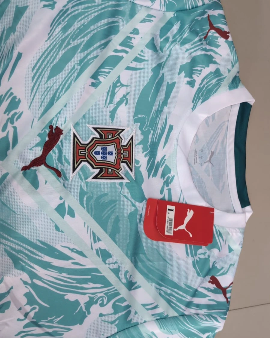 The jersey features a unique white and mint-green abstract pattern, inspired by dynamic movement and energy on the pitch. Built with lightweight, breathable fabric, it helps keep you cool and dry during intense matches or training sessions. The iconic Portugal crest and Puma logo add an authentic and professional touch.